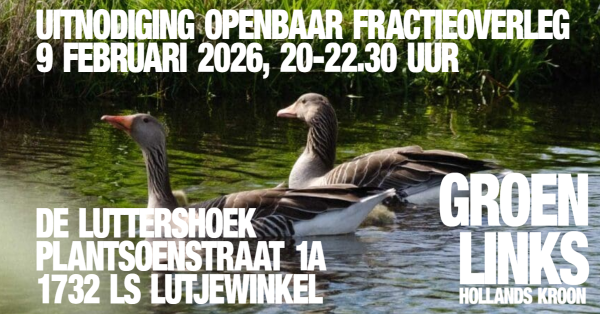 LUTJEWINKEL – Op maandag 9 februari 2026 zijn leden, belangstellenden en insprekers van harte welkom bij de openbare fractievergadering van GroenLinks Hollands Kroon. Actuele kwesties en de agenda van de raadsvergadering van donderdag 17 februari 2026 worden besproken. Kom vooral meedenken en meepraten!Tijd: 20 tot uiterlijk 22.30 uur.Plaats: de Luttershoek, Plantsoenstraat 1A, 1732 LS Lutjewinkel […]