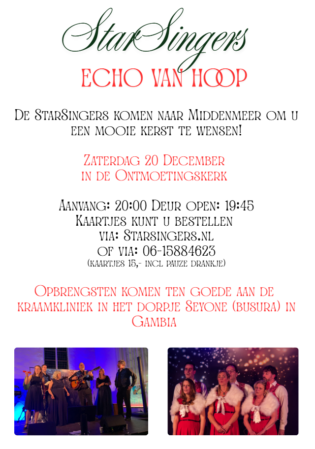 MIDDENMEER – Stel je voor: Het is de zaterdag voor Kerst en je loopt door het dorp langs de huizen en winkels. De straten worden verlicht door de lichtjes aan de huizen of bomen; je merkt aan alles dat het bijna Kerstmis is. Dan loop je langs de Ontmoetingskerk en je ziet mensen bewegen naar […]