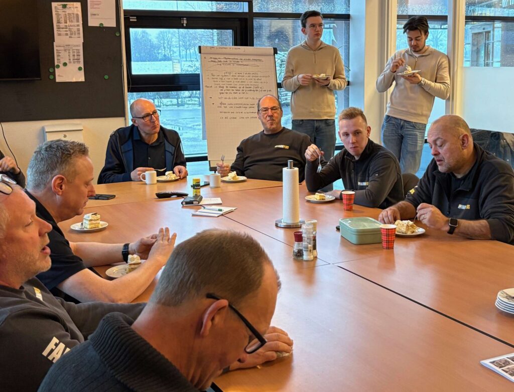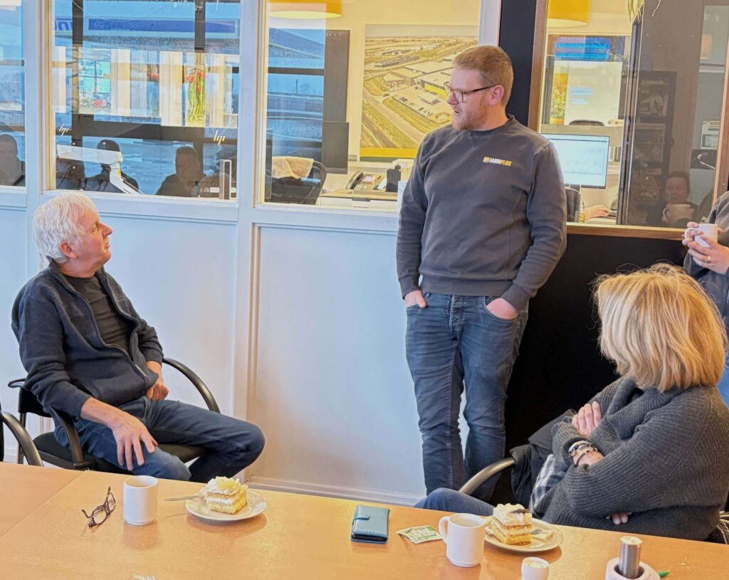 De personeelsleden van Farmplus werden allemaal uitgenodigd in de kantine voor een bak koffie en een lekker stuk slagroomtaart. En natuurlijk om afscheid te nemen van Klaas. Ook de familieleden van Klaas waren aanwezig.