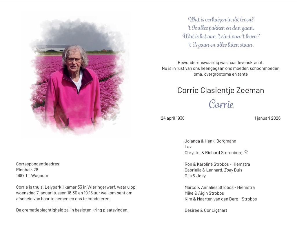 Familiebericht: overleden mevrouw Corrie Zeeman