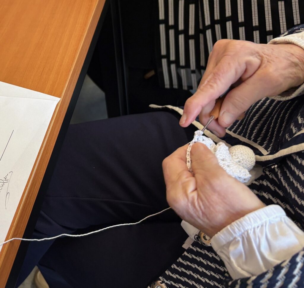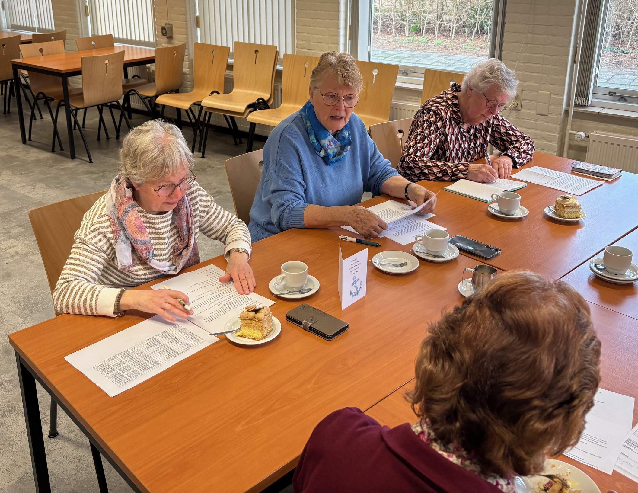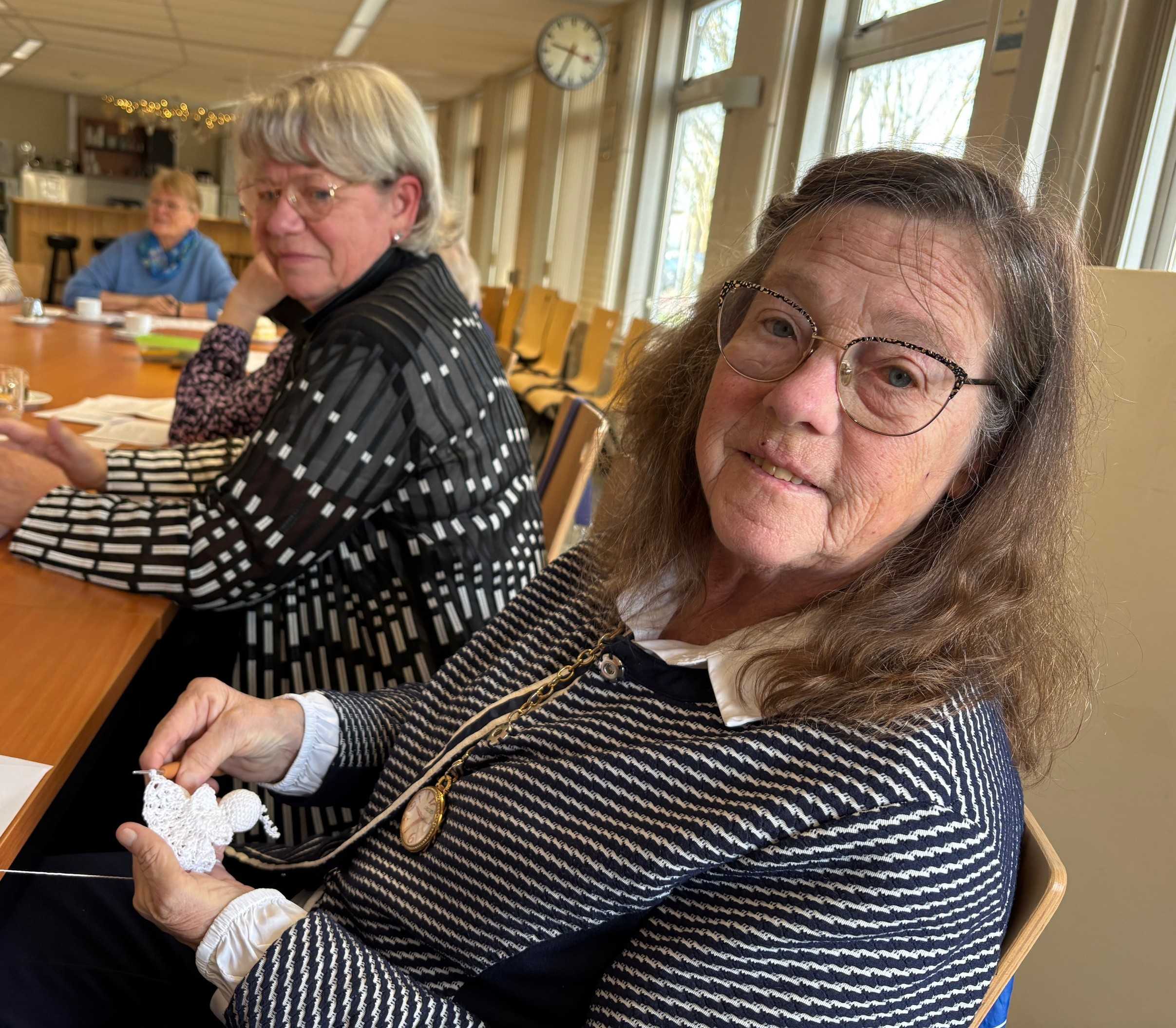 Nadat voorzitster Coba de Geus aangaf dat de medewerker van De Wieringermeerder toch echt was uitgenodigd en welkom was, werd er hartelijk om gelachen. Hij viel ook gelijk met zijn neus in de boter. Met een heerlijk gebakje en een lekkere kop koffie kon hij nog net de laatste notulen meekrijgen. Naast hem was een dame tegelijkertijd een prachtig wit engeltje aan het punniken. “Die maak ik voor al mijn kleinkinderen”, zo vertelde ze.