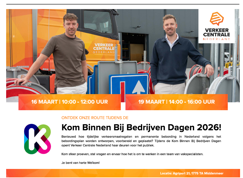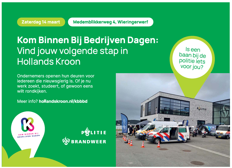 In Hollands Kroon wordt volop gewerkt aan vernieuwing en toekomstbestendige oplossingen. Van techniek en agrarische innovatie tot duurzame energie, logistiek en digitalisering: onze ondernemers zijn betrokken, vooruitstrevend en trots op hun vak. Wij horen vaak dat werken in de buurt meer rust, minder reistijd en een betere balans brengt en deze week laat zien hoeveel carrièremogelijkheden er daadwerkelijk binnen handbereik liggen. Bekijk op kbbbd.nl welke bedrijven meedoen en meld je aan. ECW staat zaterdag 14 maart op de gemeentewerf. Verkeer Centrale Nederland (Agriport 21) is 16 en 19 maart te bezoeken