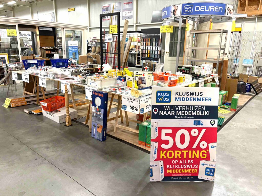 Vandaag is het totale leegverkoop in de vestiging Middenmeer met 50 % korting op alles. Kluswijs is geopend tot 15.00 uur vanmiddag.