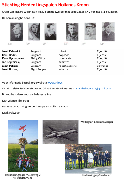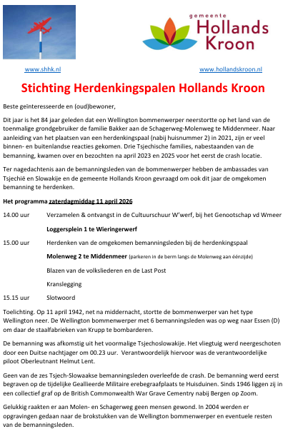 Herdenking aan de Schagerweg – Molenweg 2 Middenmeer voor de omgekomen Tsjechische Slowaakse bemanning. Verzamelen 14.00 uur bij de Cultuurschuur, herdenking 15.00 uur Molenweg 2.