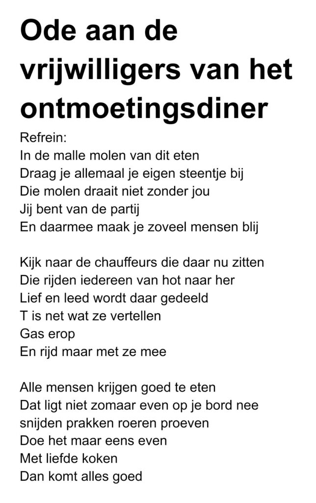 Het Ontmoetingsdiner biedt alleenstaanden een warme en gezellige plek om samen te eten en elkaar te ontmoeten. Achter de schermen werkt een grote groep vrijwilligers samen om dit te realiseren. Van koks en keukenhulpen tot gastvrouwen en gastheren aan tafel. Ook afwassers, chauffeurs die gasten van en naar huis brengen en vrijwilligers die de tafels aankleden met bloemen leveren een waardevolle bijdrage.